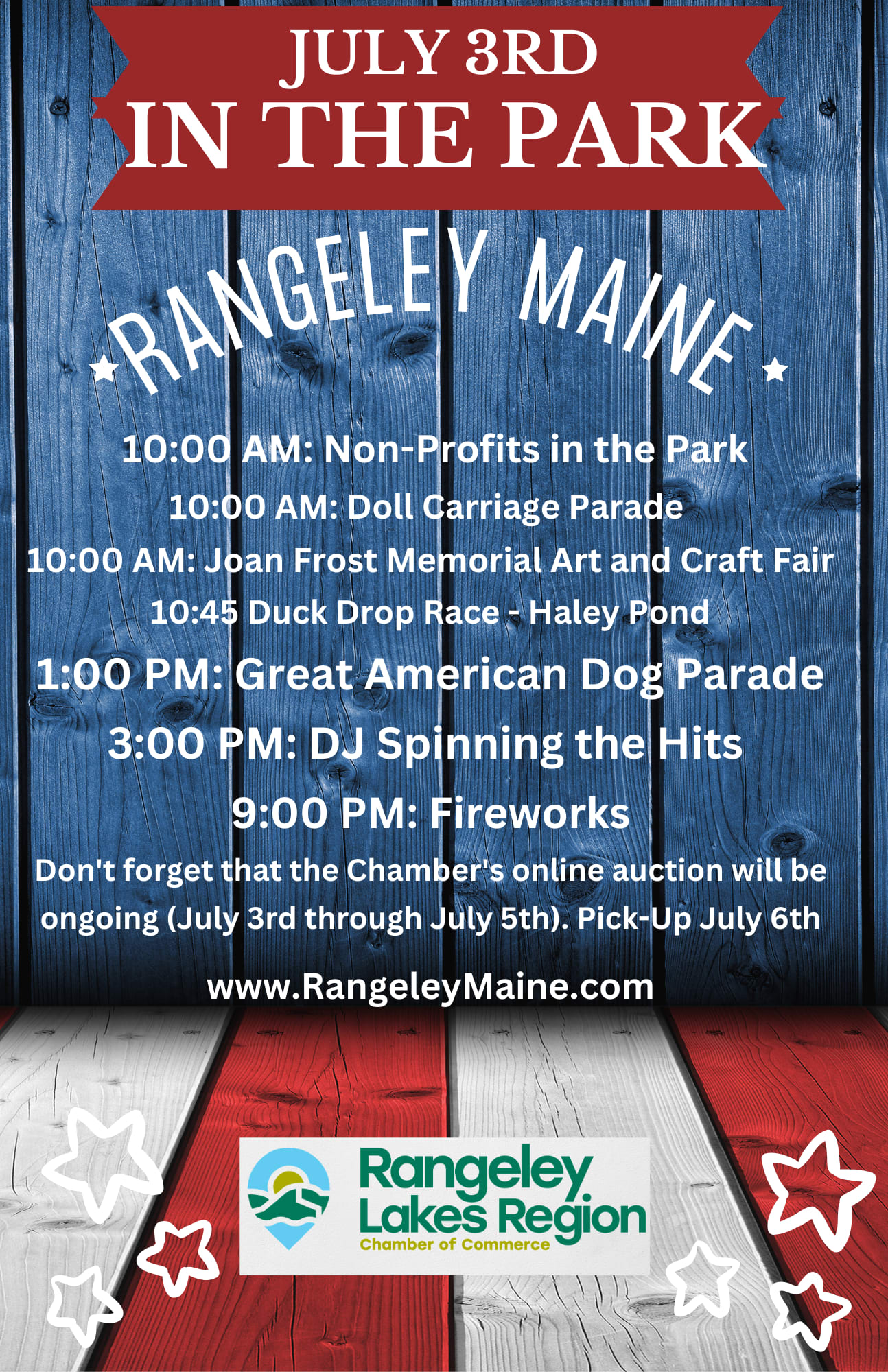Join us for an unforgettable day of fun and excitement in Rangeley on July 3rd as we kick off our epic Fourth of July celebration at 10:00 AM! Prepare for various activities, including amazing local art, yummy food, and fun entertainment. Our local nonprofit organizations have worked hard to bring you an extravaganza that's perfect for the whole family. Don't forget to bring your furry friend to participate in the Great American Dog Parade! Also, be sure to check out the Chamber's Online Auction, which runs from July 3rd through July 5th.