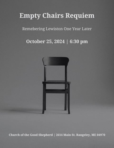 The Church of the Good Shepherd in Rangeley invites the community to a service of remembrance on the first anniversary of the Lewiston Shootings. The candle-light service will begin at 6:30 p.m. on Friday, October 25, and will feature short readings and prayers, as well as time to reflect at eighteen prayer stations, each set with an empty chair representing one of the lives lost in the tragedy. The empty chair is a familiar symbol that reaches across secular and religious traditions to represent the mystery of both presence and absence.