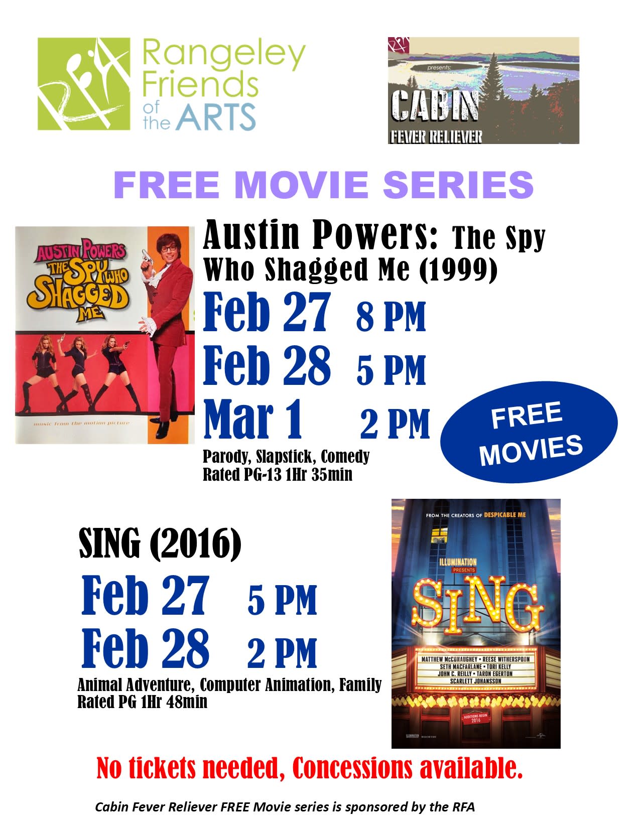 The Rangeley Friends of the Arts (RFA) will present six weekends of FREE movies at the RFA Lakeside Theater in Rangeley starting February 20th and running through March as part of our Cabin Fever Reliever Free Film Series. No tickets needed. Doors open 45 minutes prior to start time, and our concession stand, including beer/wine, will be available. For our full schedule of events visit www.rangeleyarts.org