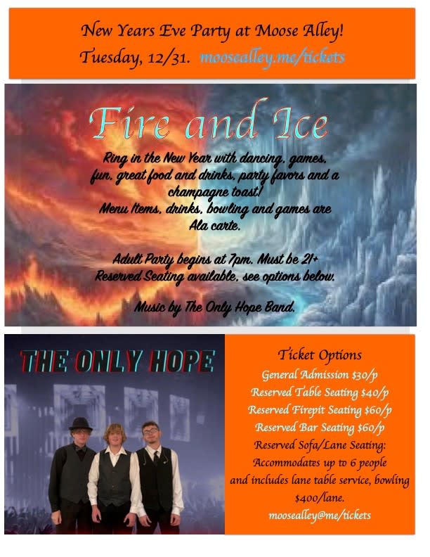 Party of the Year is Here! Dancing, Games, Bowling, Food & Drinks and a Champagne Toast! Live music with The Only Hope!!