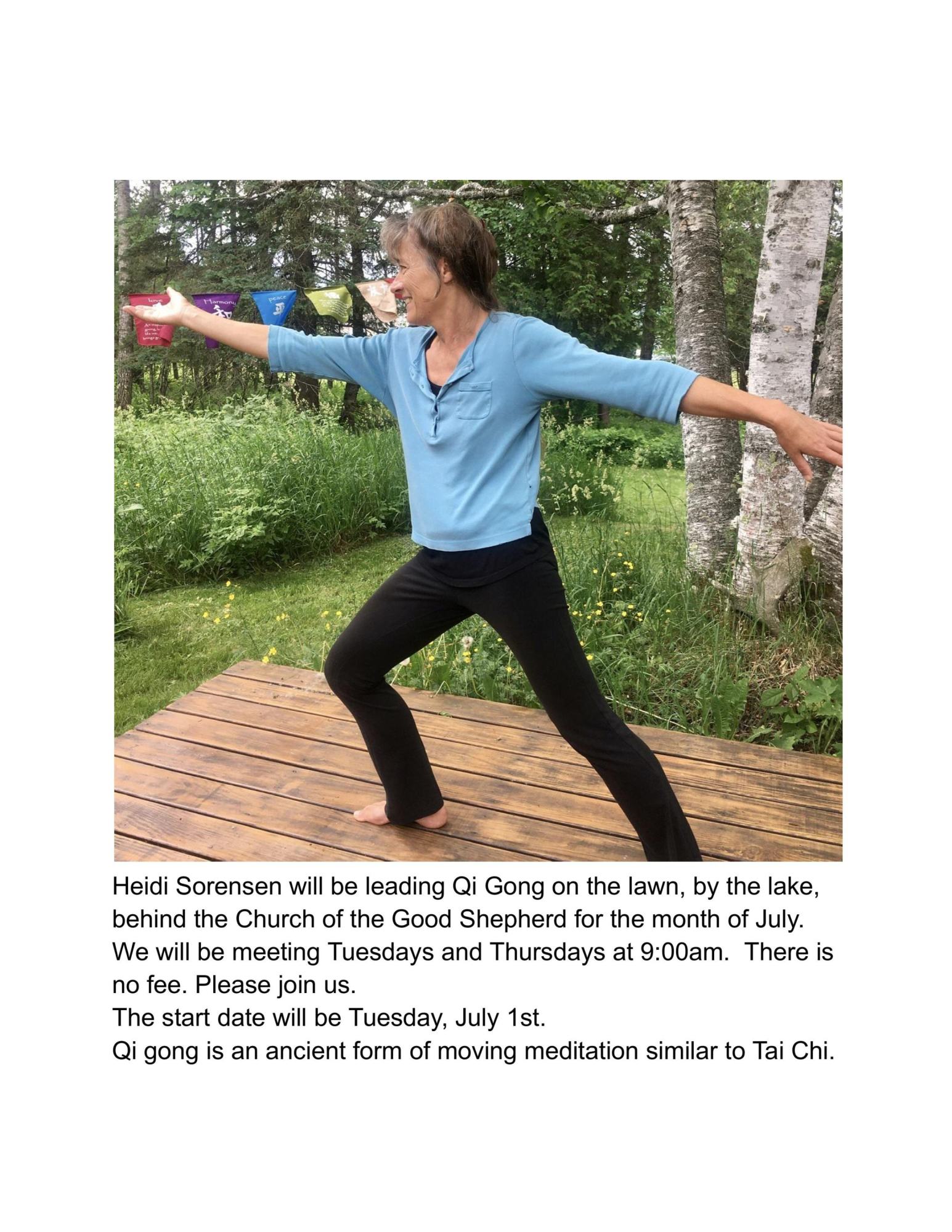 Guest leader in August is Pam Ellis. She will be leading Qi Gong on the lawn, by the lake, behind the Church of the Good Shepherd for the month of August. We will be meeting Tuesdays and Thursdays at 9:00 AM. There is no fee. Please join us. Qi gong is an ancient form of moving meditation similar to Tai Chi.