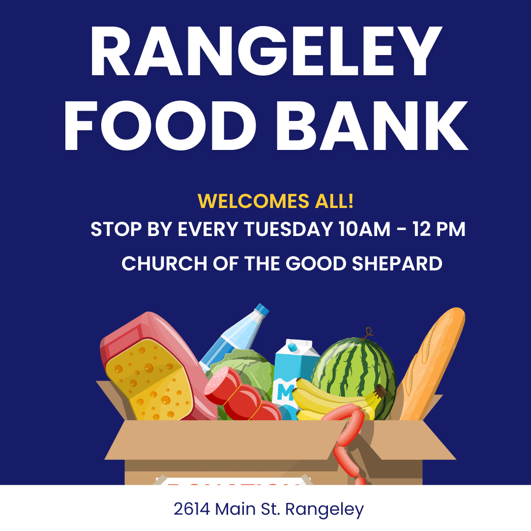 Rangeley Food Bank welcomes EVERYONE! Stop by every Tuesday from 10:00 AM until 12:00 PM.