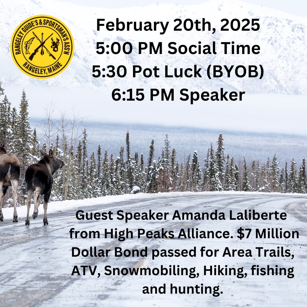 February 20th, 2025 5:00 PM Social Time 5:30 Pot Luck (BYOB) 6:15 PM Speaker Guest Speaker Amanda Laliberte from High Peaks Alliance. $7 Million Dollar Bond was passed for Area Trails, ATV, Snowmobiling, Hiking, fishing, and hunting.