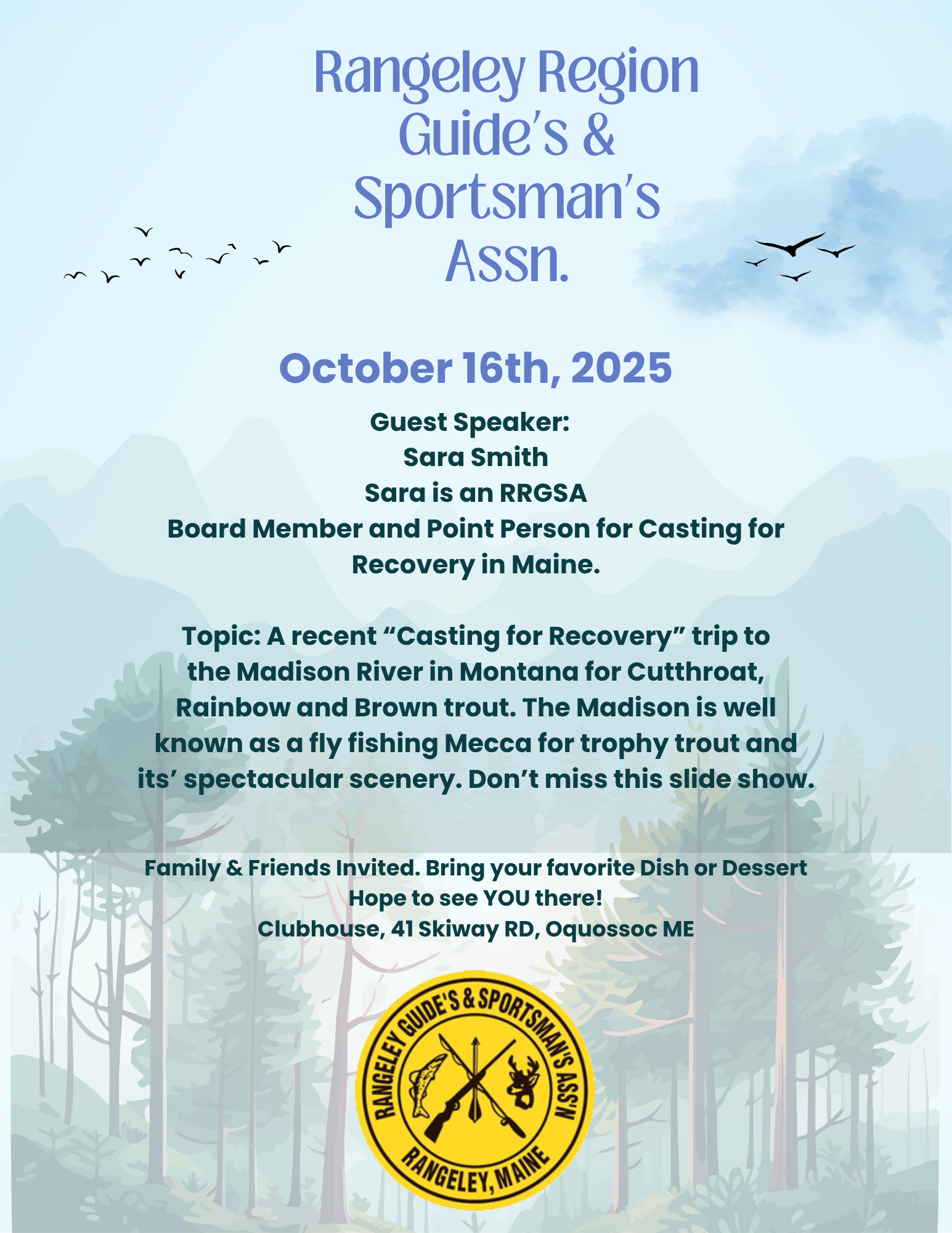 Guest Speaker: Sara Smith Sara is an RRGSA Board Member and Point Person for Casting for Recovery in Maine. Topic: A recent “Casting for recovery” trip to the Madison River in Montana for Cutthroat, Rainbow, and Brown trout. The Madison is well known as a fly fishing Mecca for trophy trout and its spectacular scenery. Don’t miss this slide show. Family & Friends Invited. Bring your favorite Dish or Dessert. Hope to see YOU there! Clubhouse, 41 Skiway RD, Oquossoc, ME.