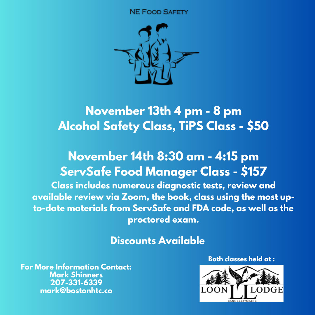 November 13th, Loon Lodge: Alcohol Safety Class. TiPS class. Anyone signing up for both classes receives 10% off the TiPS class. Class runs from 4:00 PM until 8:00 PM. Cost is $50/pp. Organizations sending 4 or more people receive 10%. November 14th. Loon Lodge: 8:30 AM until 4:15 PM. May get out sooner depending on exam. How Much: $157 pp. Maine’s only bilingual ServSafe instructor (Spanish/English). Guaranteed to excite, enthrall and entertain while educating. Class includes numerous diagnostic tests, review and available review via Zoom, the book, class using the most up-to-date materials from ServSafe and FDA code, as well as the proctored exam. Kicker: 2-3 signups, receive 5% discount. 4 or more, 10%. This class will fill up. Contact Mark Shinners, NE Food Safety for more details. 207-331-6339 mark@bostonhtc.co The link to register for the SelfServ is ServSafe Training offered throughout Northern New England, North Shore and Citrus County, Florida. (youeatsafe.com)Images
