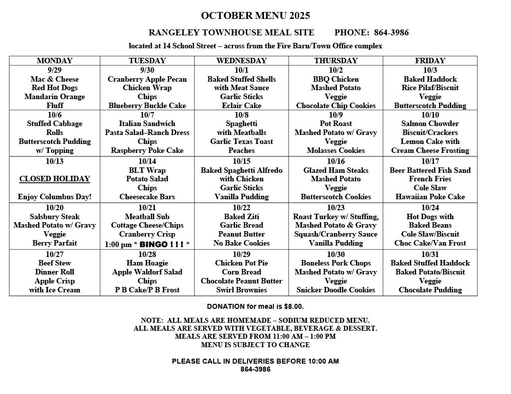 All meals are homemade - sodium-reduced menu and include vegetables, beverages and dessert. Wheat or rye bread and crackers are also available. Meals are served from 11:00 AM - 1:00 PM Monday thru Friday. Please call-in deliveries before 10:00 AM (864-3986). Suggested Donations for meals are $8.00. The menu is subject to change.