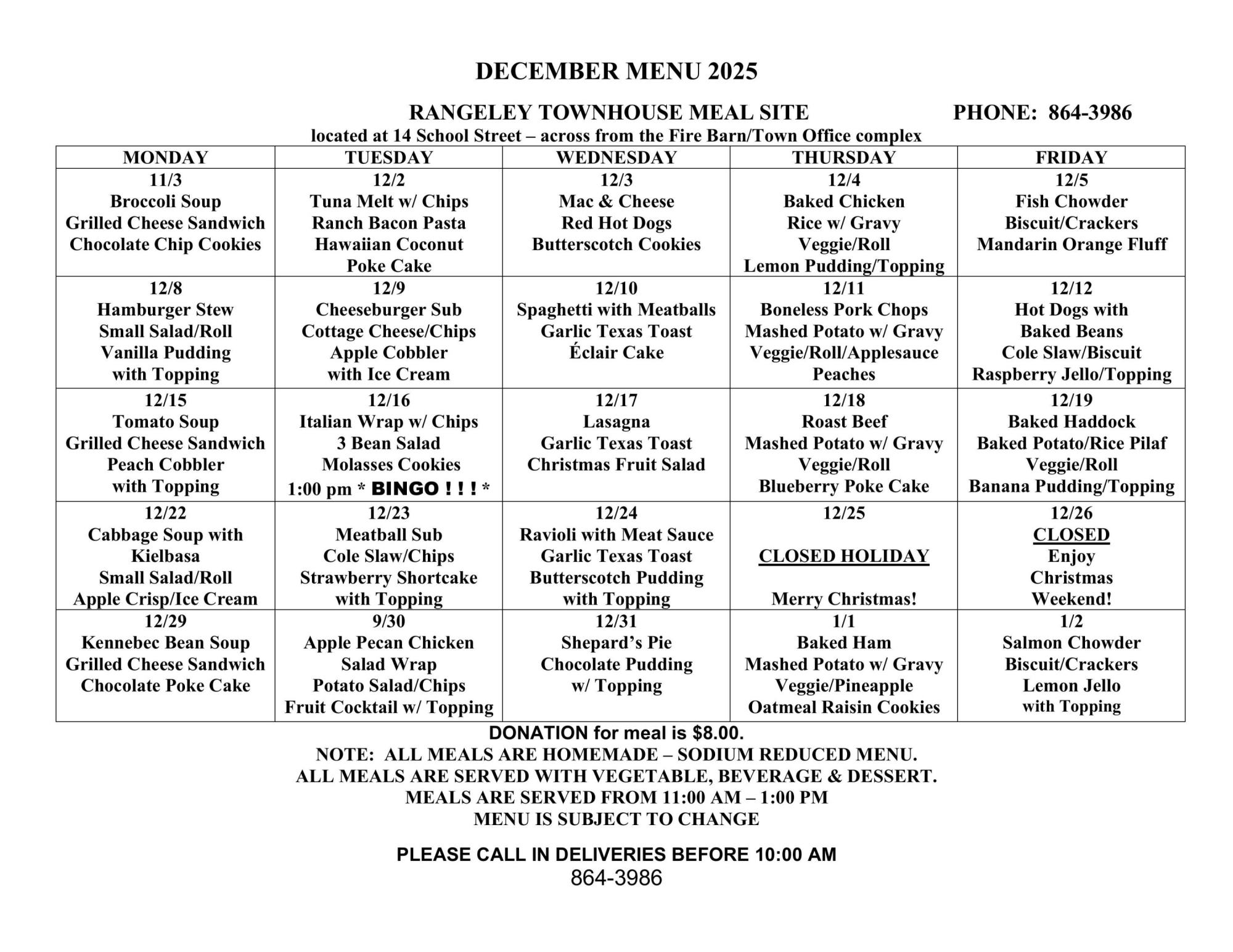 All meals are homemade - sodium-reduced menu and include vegetables, beverages and dessert. Wheat or rye bread and crackers are also available. Meals are served from 11:00 AM - 1:00 PM Monday thru Friday. Please call-in deliveries before 10:00 AM (864-3986). Suggested Donations for meals are $8.00. The menu is subject to change.