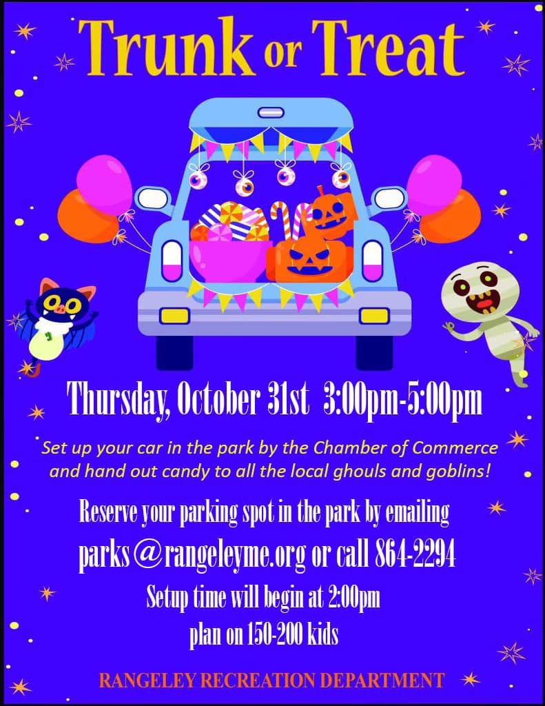 Thursday, October 31st, from 3:00 PM—5:00 PM. Park your car by the Chamber of Commerce and hand out candy to all the local ghouls and goblins! Reserve your parking spot by calling 864-2294 or emailing parks@rangeleyme.org.