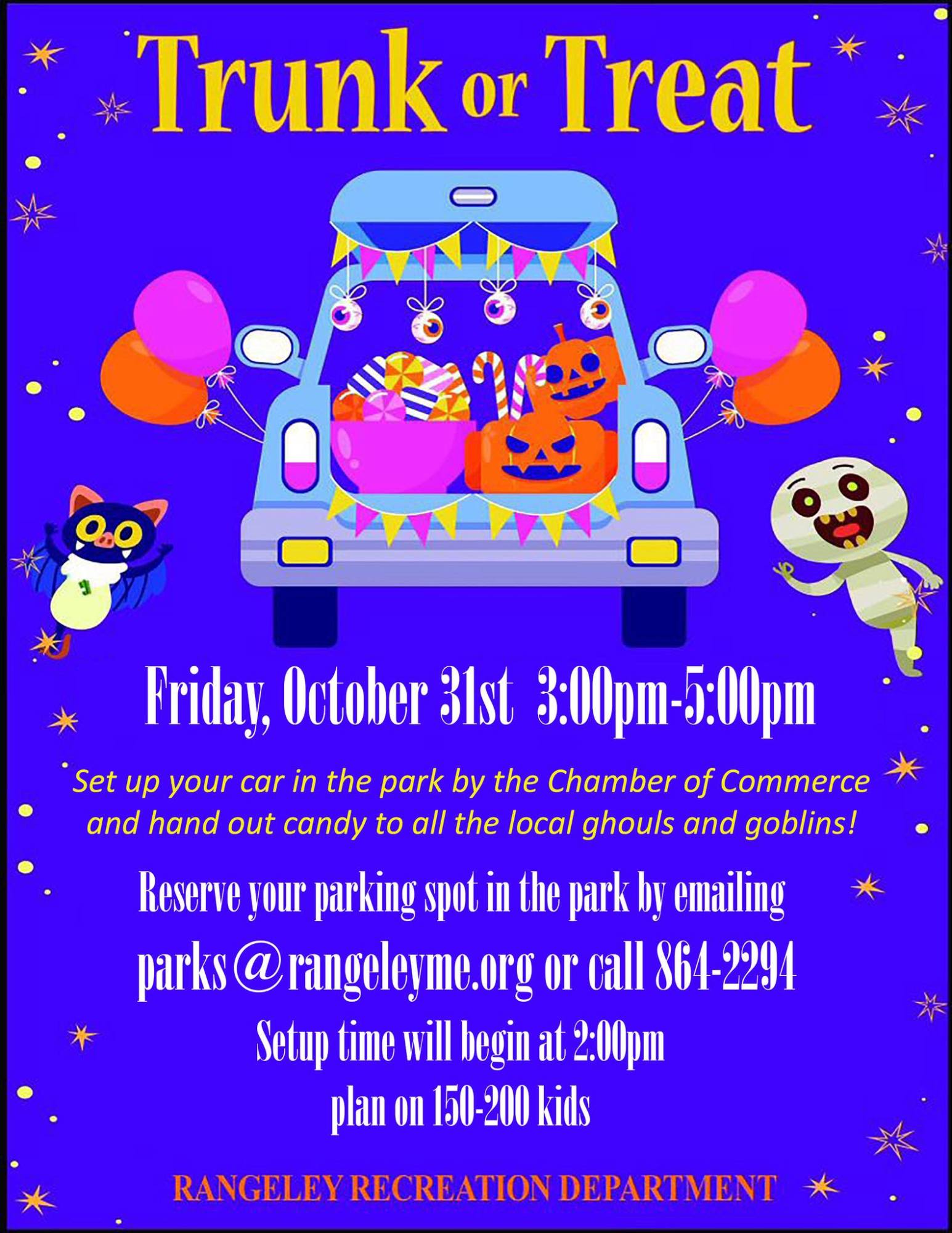 October 31st, from 3:00 PM to 5:00 PM. Park your car by the Chamber of Commerce and hand out candy to all the local ghouls and goblins! Reserve your parking spot by calling 864-2294 or emailing parks@rangeleyme.org.