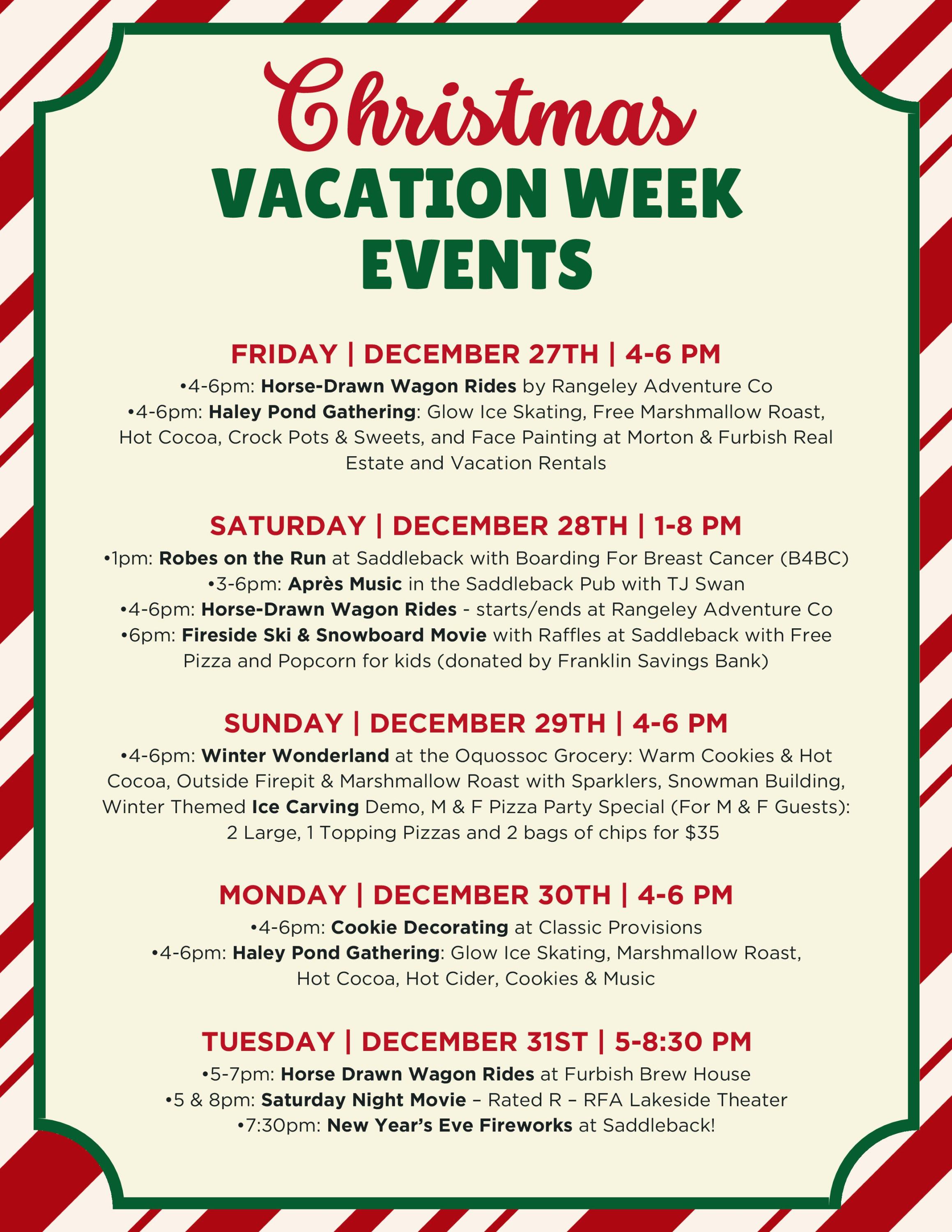 Warm Cookies & Hot Cocoa, Outside Firepit & Marshmallow Roasting, Sparklers, Snowman Building, Winter Themed Ice Carving Demo and more!
