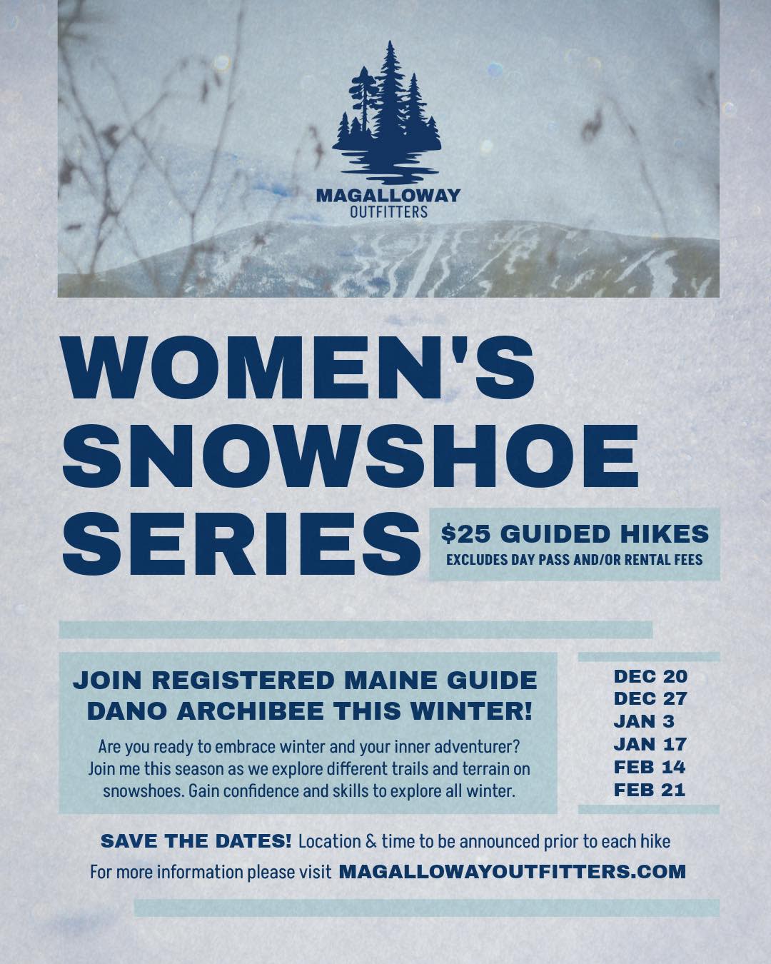 Join Dano Archibee this season for a new Women’s Snowshoe Series! Location and time to be announced closer to each scheduled hike. Hope to see you next month! For more information, please visit magallowayoutfitters.com