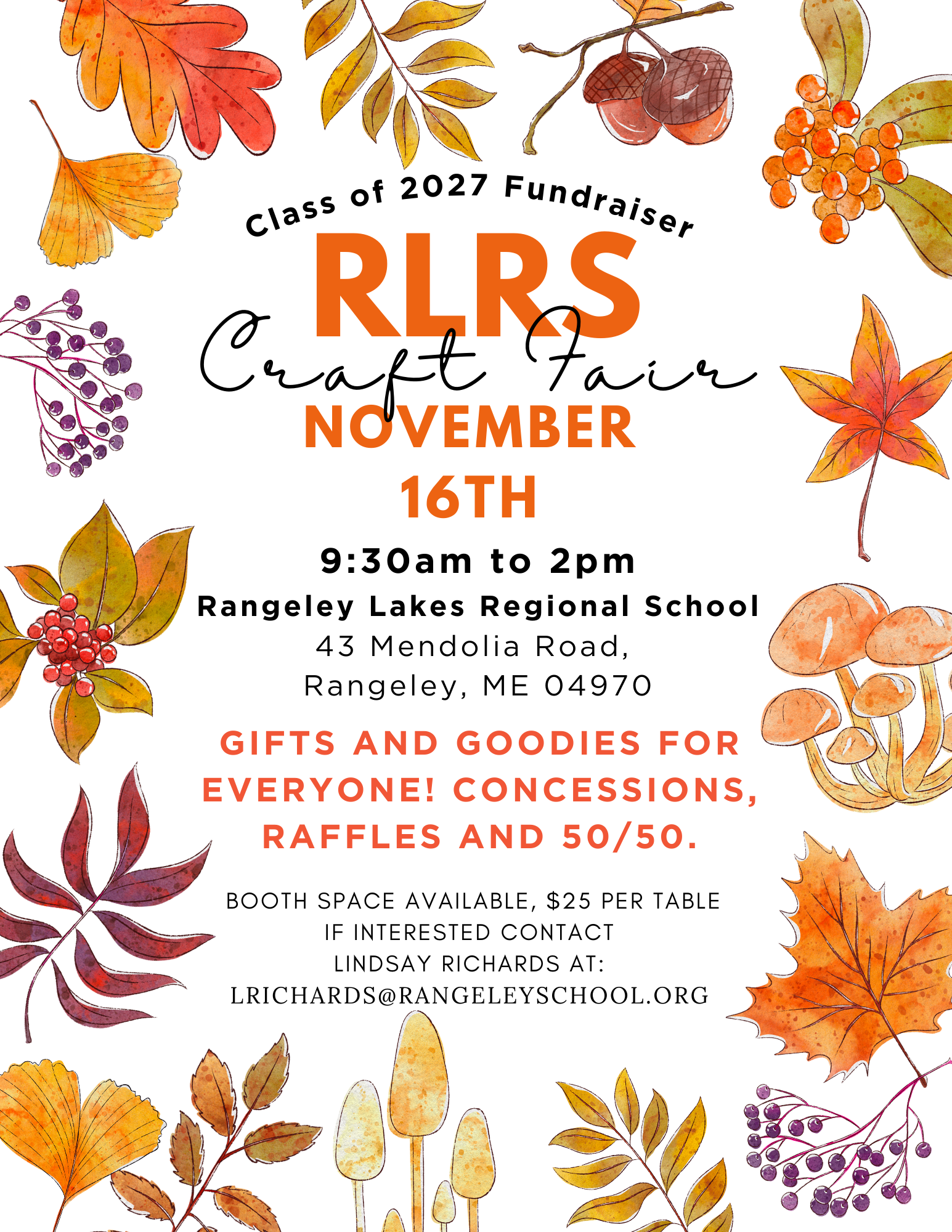 Join us at the Rangeley Lakes Regional School for a 40 plus vendor craft fair to support the Rangeley Lakes Regional School Class of 2027. Crafts, Baked Goods, Books, Blankets, and so much more!