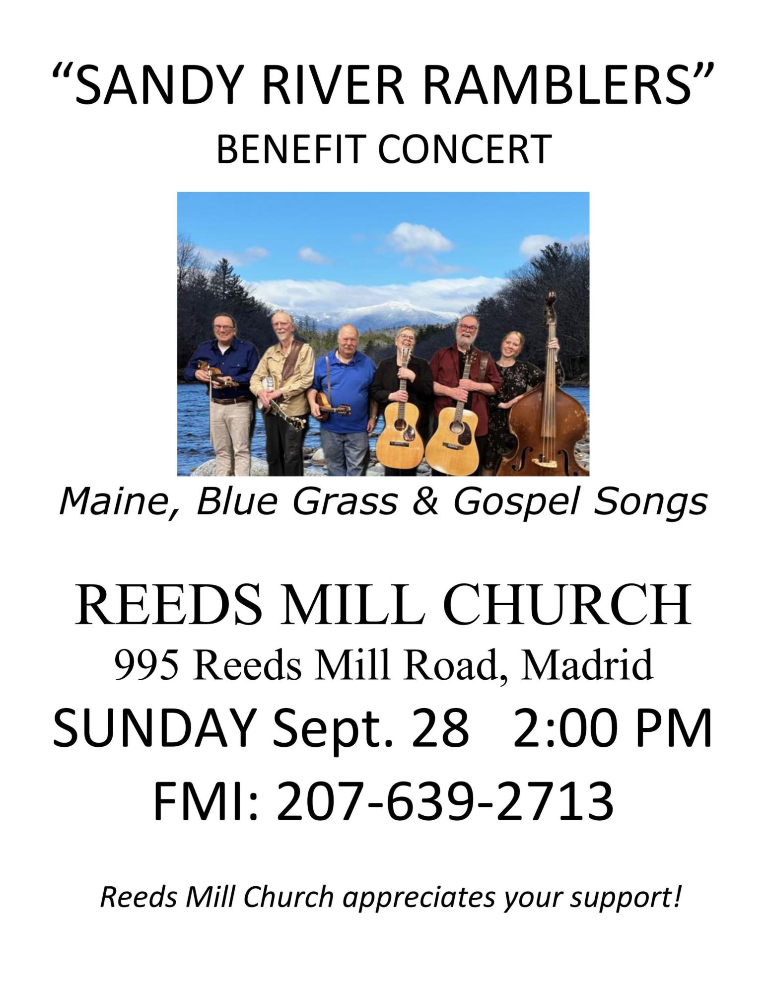 Maine, Blue Grass & Gospel Songs REEDS MILL CHURCH 995 Reeds Mill Road, Madrid SUNDAY Sept. 28 2:00 PM FMI: 207-639-2713 Reeds Mill Church appreciates your support!