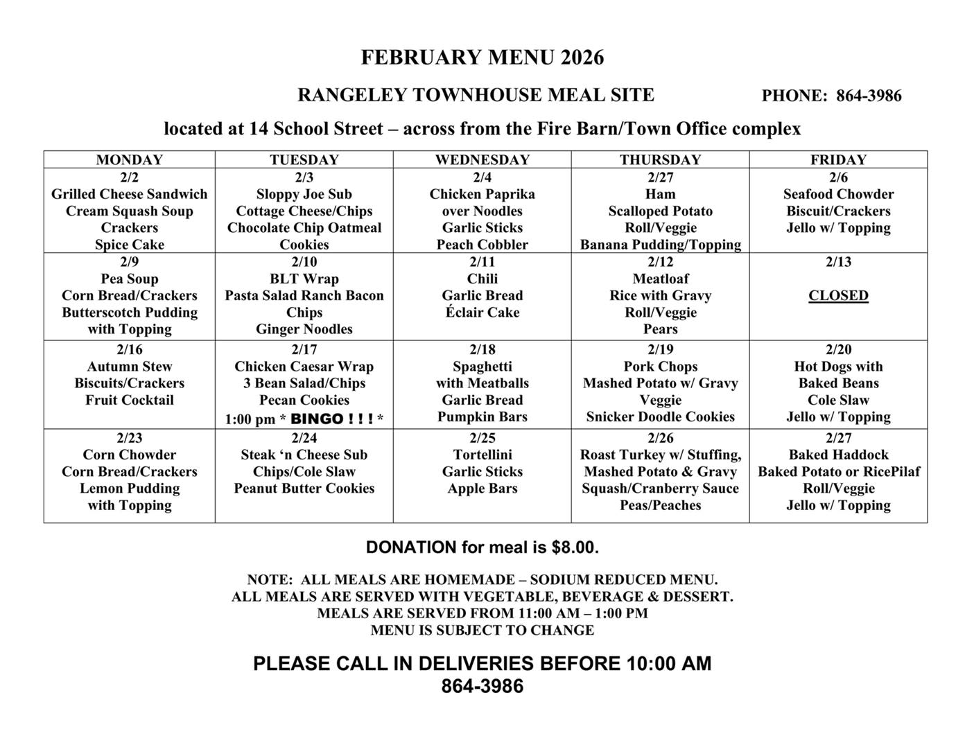 All meals are homemade - sodium-reduced menu and include vegetables, beverages and dessert. Wheat or rye bread and crackers are also available. Meals are served from 11:00 AM - 1:00 PM Monday thru Friday. Please call-in deliveries before 10:00 AM (864-3986). Suggested Donations for meals are $8.00. The menu is subject to change.