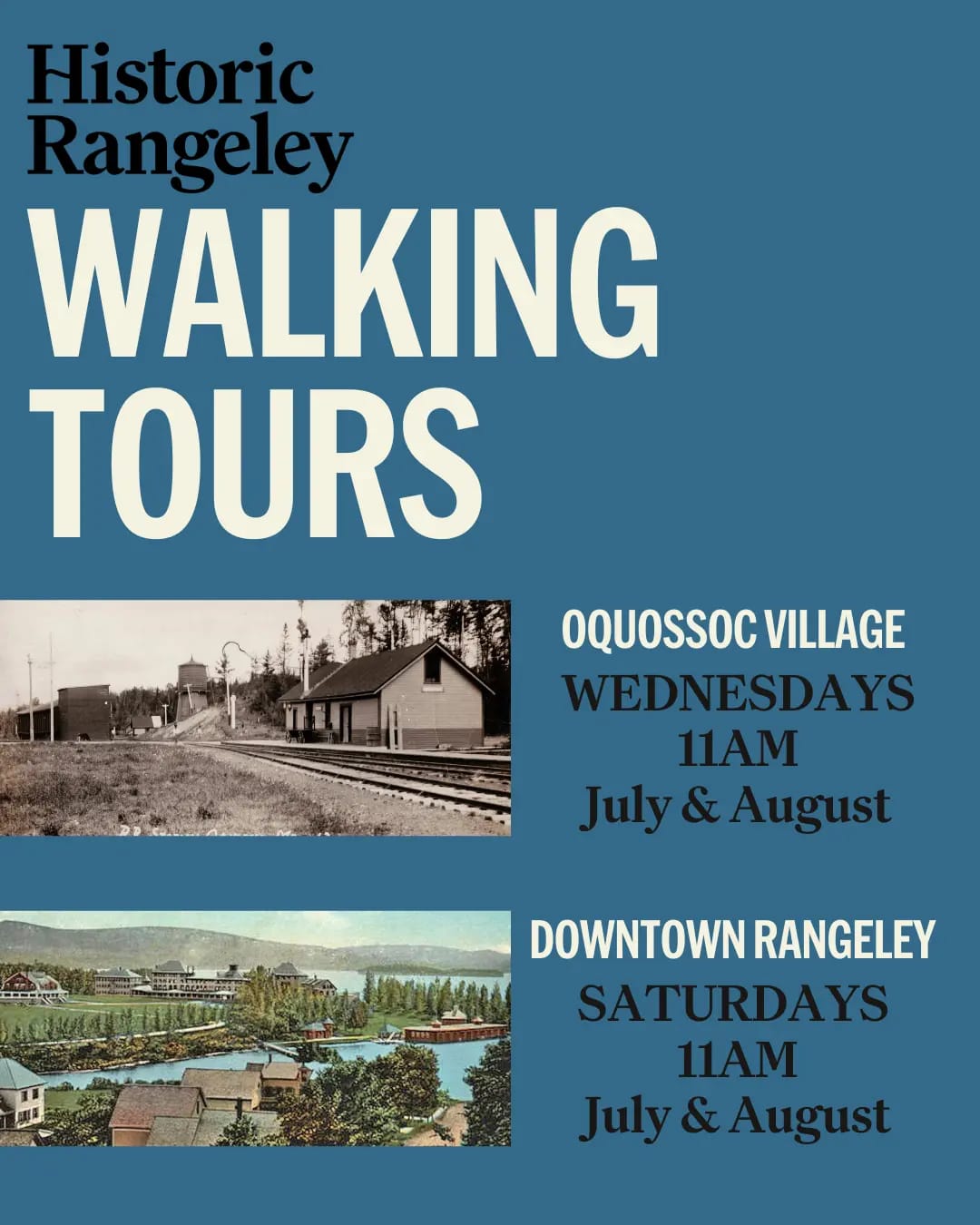 JULY and AUGUST Downtown Rangeley, Saturdays at 11AM, Meet at Rangeley History Museum Oquossoc Village, Wednesdays at 11AM, Meet at Outdoor Heritage Museum Explore the history of Rangeley and Oquossoc on foot with a knowledgeable tour guide. These one-hour tours offer a unique perspective of the region's past, discovering the sites of the region's earliest buildings and businesses in downtown Rangeley and Oquossoc Village. See images from the Historic Rangeley collections and transport yourself back in time to the region's gilded age, all while getting a bit of exercise and exploring these charming village neighborhoods. Each tour is approximately one mile round trip. Tours are operated weather-permitting. $5 for non-members / FREE for members Free for children 18 and under Tours are limited to 10 individuals, so please arrive early to reserve your space Well-behaved dogs welcome!