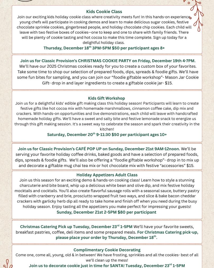 Join our exciting kids holiday cookie class where creativity meets fun! In this hands-on experience, young chefs will participate in cooking demos and learn to make delicious sugar cookies, festive chocolate sprinkle cookies, gingerbread people, and holiday chocolate chip cookies. Each child will leave with two festive boxes of cookies—one to keep and one to share with family friends. There will be plenty of cookie tasting and hot cocoa to make this time complete. Sign up today for a delightful holiday class. Thursday, December 18th 3PM-5PM $50 per participant ages 8+
