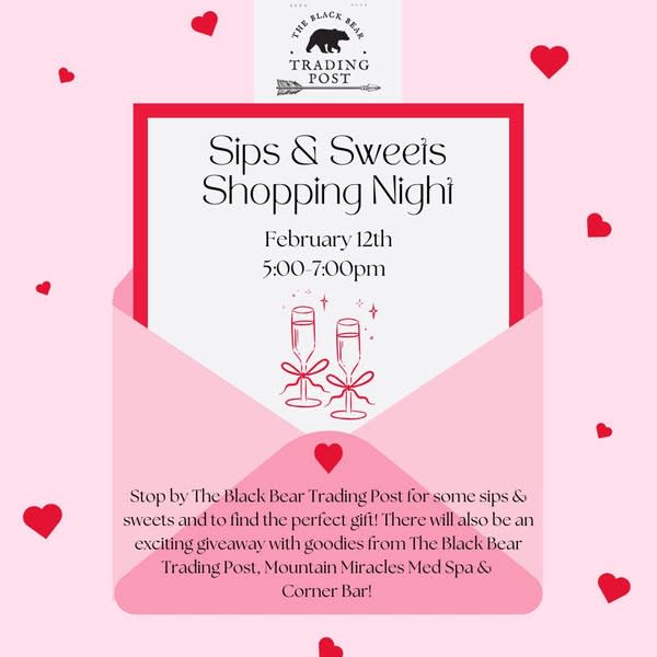 Visit the Black Bear Trading Post for drinks and treats while finding the perfect gift. There will also be an exciting giveaway featuring goodies from Black Bear Trading Post, Mountain Miracles & Spa, and The Corner Bar!